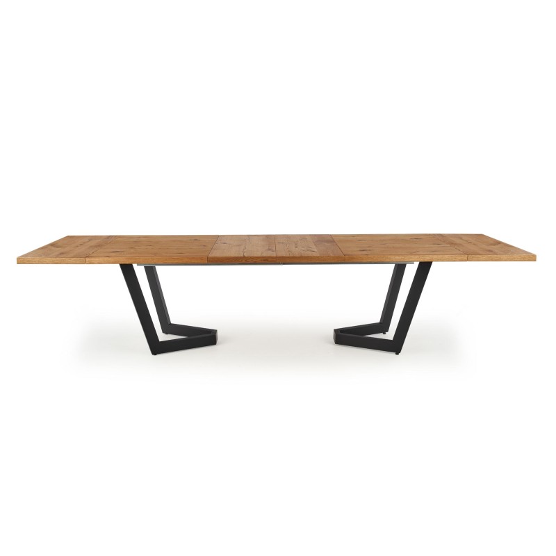 Stół loft rozkładany MASSIVE to propozycja dla tych, którzy szukają połączenia surowej estetyki i praktycznych rozwiązań. W wersji podstawowej mierzy 160 × 90 cm, ale dzięki mechanizmowi można rozłożyć go do 250 × 90 cm. Blat wykonano z płyty fornirowanej w odcieniu jasnego dębu z elementami drewna litego na obrzeżach, co dodaje mu elegancji i naturalnego charakteru. Nogi i stelaż to mocna stal malowana proszkowo na czarno, co zapewnia wytrzymałość i stabilność nawet przy dużym obciążeniu. Całość utrzymana jest w stylistyce loftowej z industrialnym akcentem — idealna do nowoczesnych wnętrz.