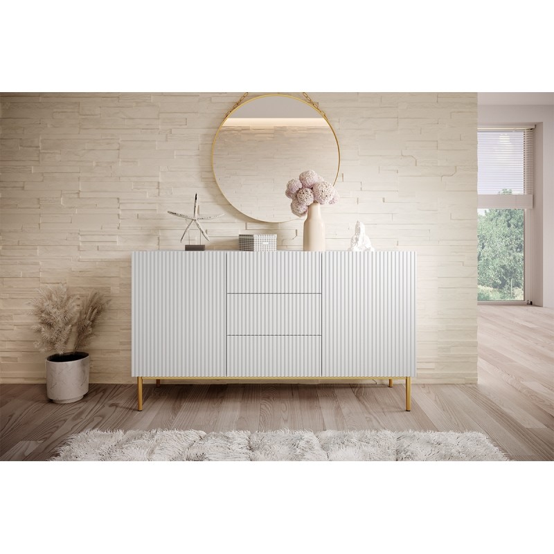 Komoda Nicole 150 cm z trzema szufladami - biały mat + złote nóżki